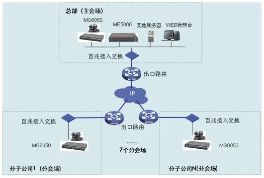 集團(tuán)總部主會(huì)場(chǎng)和各個(gè)分會(huì)場(chǎng)各部署一臺(tái)H3C公司的MG6050多媒體網(wǎng)關(guān),同時(shí)支持H.323和SIP協(xié)議,支持H.263/H.264編碼技術(shù)和4CIF高清晰圖像分辨率,最高可以提供2M會(huì)議帶寬。集團(tuán)總部主會(huì)場(chǎng)和各個(gè)分會(huì)場(chǎng)推薦使用Sony D70攝像頭。