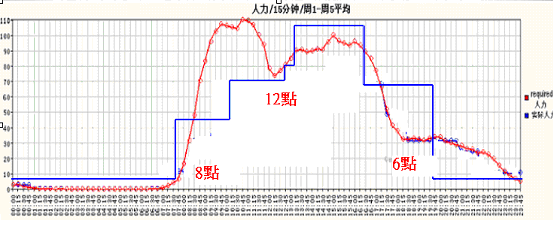 大家看到圖一中紅色的線,就是一天里面電話進(jìn)來的數(shù)量,藍(lán)色的線是安排的人力?梢郧宄吹剑涸缟8點(diǎn)一開始,電話就一直進(jìn)來;中午來電的客戶開始去吃飯,電話就開始下滑;然后等到客戶吃完中飯,電話又開始進(jìn)來,下午又出現(xiàn)另外一個高峰;一直到5點(diǎn)以后又開始下滑,6點(diǎn)以后電話相對就少很多。