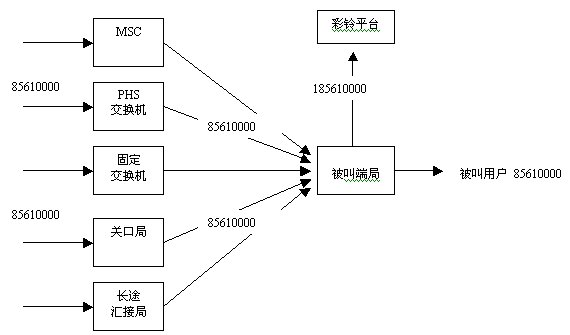 - 當(dāng)主叫呼叫彩鈴業(yè)務(wù)用戶歸屬的交換機(jī)時(shí)時(shí),被叫交換機(jī)判斷這個(gè)用戶有"彩鈴屬性"標(biāo)志,并不馬上接通業(yè)務(wù)用戶(被叫),而是在被叫號(hào)碼前面加上一個(gè)彩鈴平臺(tái)的號(hào)碼前綴,這樣被叫號(hào)碼成了"前綴1+原被叫號(hào)碼",然后被叫交換機(jī)把這個(gè)新被叫號(hào)碼接續(xù)到彩鈴平臺(tái);