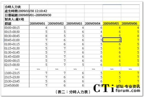 分時人力表在管理上有重要的地位,用于檢視時間內(nèi)排定的出席人數(shù),通常是將此數(shù)據(jù)與預測的話務需求做比對,檢查排定人力數(shù)與話務曲線的擬合度。在現(xiàn)場管理時,則用于小休調(diào)度,避免小休人數(shù)過多,使出席人數(shù)降到關鍵少數(shù)的臨界點下,造成服務水平大幅跌落的狀況發(fā)生。