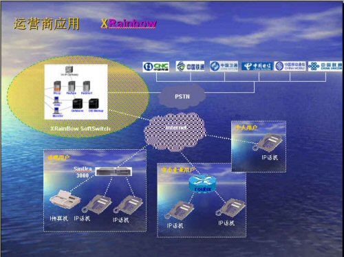 。。首先我們需要這4個(gè)地點(diǎn)都有自己的網(wǎng)絡(luò)接入,最好是寬帶。以北京總部為列,如果將Xrainbow系統(tǒng)放在北京總部,這就需要北京總部這邊有一個(gè)固定IP地址的網(wǎng)絡(luò)接入,其他分公司不需要固定ip地址,只要可以上網(wǎng)就可以登錄到北京總部的Xrainbow系統(tǒng)。這樣企業(yè)與分支機(jī)構(gòu)之間就實(shí)現(xiàn)了零話費(fèi),同時(shí)還可以提供傳真業(yè)務(wù)。另外終端設(shè)備可以隨意移動(dòng),只要可以上網(wǎng)的地方就可以接入我們的終端設(shè)備,免去了因公司的發(fā)展或者搬動(dòng)而要去申請(qǐng)初裝大量電話的煩惱。