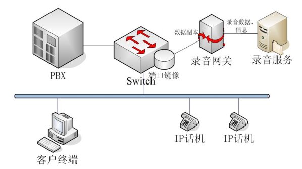 NETLOG VOIP語音記錄系統(tǒng)采用端口鏡像技術,在要錄音網(wǎng)絡的PBX上將所有的數(shù)據(jù)包生成一個副本,在不影響主線傳輸?shù)幕A上,把副本傳送到錄音網(wǎng)關RG(Record