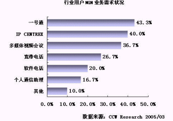 NGN 成為電信運(yùn)營商滿足用戶需求的有力武器。不同的行業(yè)用戶對(duì)基于 NGN 推出的電信業(yè)務(wù)表現(xiàn)出了較大的需求差異,例如: IT通信、物流和服務(wù)業(yè)對(duì) IP CENTREX 、多媒體視頻會(huì)議和寬帶電話等業(yè)務(wù)比較感興趣,而政府用戶對(duì)一號(hào)通等業(yè)務(wù)比較感興趣。不同行業(yè)對(duì)業(yè)務(wù)需求具有差異性,這就要求運(yùn)營商基于 NGN 平臺(tái)開發(fā)的業(yè)務(wù)要有更大的靈活性,要有突出用戶通信需求的整體解決方案,要能滿足用戶的個(gè)性化需求。