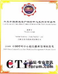 客戶聯(lián)絡(luò)中心標準委員會層層評估和共同審定,上海寶東(DataTool)及VERINT雙雙獲得“2009中國呼叫中心排班管理軟件獎”,這一大獎的頒發(fā)是ICMI對寶東及VERINT的肯定與支持,代表著權(quán)威機構(gòu)對VERINT的WFM排班管理軟件在呼叫中心行業(yè)中的貢獻及對寶東公司技術(shù)服務(wù)能力的認可及肯定。