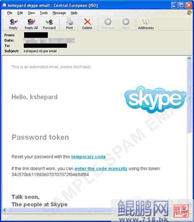 不幸的是,Skype的弱點(diǎn)漏洞在過(guò)去也曾被發(fā)現(xiàn)利用,Skype的知名度也同樣地被利用來(lái)進(jìn)行垃圾訊息攻擊。下圖所示是目標(biāo)針對(duì)Skypeg使用者的垃圾訊息: