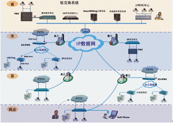 在各級辦公機構(gòu)根據(jù)原有用戶數(shù)量,可以配置IP電話綜合接入設(shè)備或IP-PBX,連接當?shù)卦械霓k公電話環(huán)境(程控電話交換機、直線市話、電信虛擬網(wǎng)等)。實現(xiàn)機構(gòu)內(nèi)部辦公電話/傳真通過IP數(shù)據(jù)網(wǎng)通信。同時機構(gòu)以外的長途電話/傳真也可以利用IP電話網(wǎng)傳輸,而不產(chǎn)生任何長途通信費用。