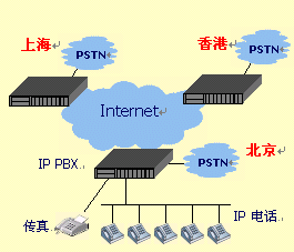 通過網(wǎng)絡(luò)電話終端IAD的內(nèi)線口(PHONE),連接當(dāng)?shù)剞k公電話環(huán)境(程控交換機\電信虛擬網(wǎng)\電話機),實現(xiàn)內(nèi)部電話通過互聯(lián)網(wǎng)通信。通過外線口(LINE)連接PSTN市話網(wǎng),實現(xiàn)注冊的外部移動電話\市話呼入,客戶服務(wù)電話的呼入,各地區(qū)間的長途電話的"落地"。