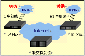 分布在各地的GV IPPBX,可以作為IP PBX平臺的網(wǎng)關(guān),所有注冊在IP PBX平臺下的話機可以分別通過各地的IP PBX網(wǎng)關(guān)落地,撥打普通電話,自由選擇最優(yōu)惠的話費平臺。一臺GV IPPBX可以支持多達4路E1,等于120條外線。 |