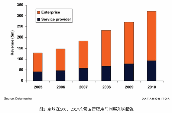 最近由Datamonitor對語音應(yīng)用方面的市場調(diào)研情況,顯示出大量的企業(yè)正在開始采用托管語音應(yīng)用,趨勢有強(qiáng)勁的增長;同時,對于托管語音應(yīng)用開發(fā)與集成也是并行的增加迅速。以下的圖表顯示全球采購?fù)泄苷Z音應(yīng)用的開發(fā)與集成與將從2005年的一億二千八百萬增至2010年三億二千萬,復(fù)合增長率達(dá)到20.1%。企業(yè)市場的采購將從八千六百萬增長到二億二千八百萬,服務(wù)運(yùn)營商市場的采購將從四千二百萬增長到九千三百萬,復(fù)合增長率為17.1%,超過相同期限。
