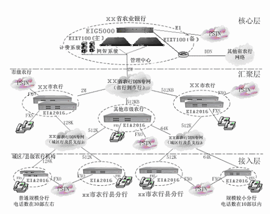 省行、各地市行與縣支行、分理處與數(shù)據(jù)業(yè)務(wù)共用專網(wǎng)線路,實(shí)現(xiàn)VOIP互連,形成一個(gè)全省范圍內(nèi)的VOIP大網(wǎng),實(shí)現(xiàn)全省內(nèi)部語(yǔ)音的免費(fèi)通信和內(nèi)部號(hào)碼的縮位拔號(hào),節(jié)省了各行間的市話費(fèi)用,節(jié)省大量長(zhǎng)途話費(fèi)。各節(jié)點(diǎn)按FXO:FXS