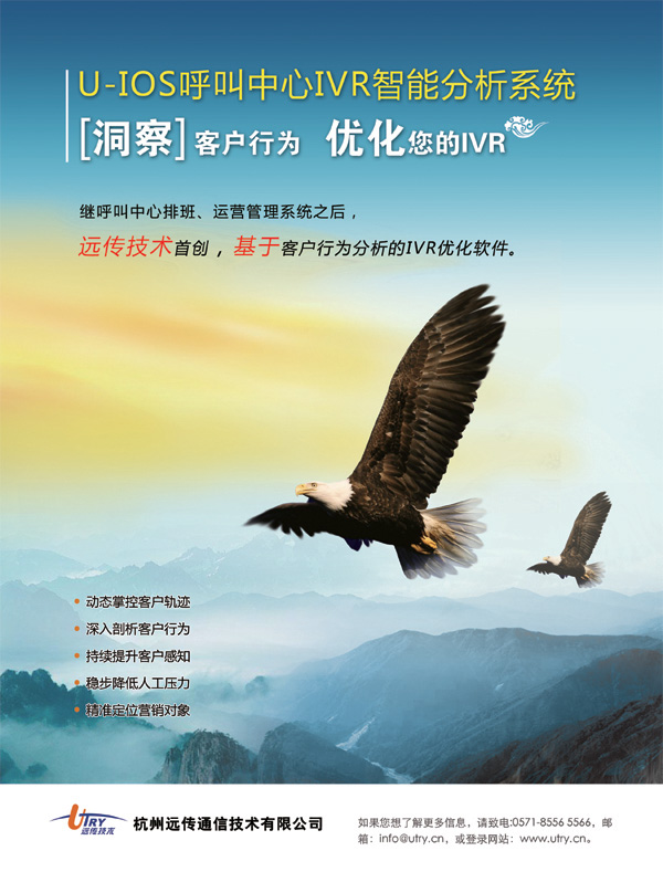 杭州遠傳通信技術有限公司是國家高新技術企業(yè)、雙軟企業(yè),具備軟件成熟度CMMI 3級資質,是專業(yè)的客戶服務管理軟件及咨詢服務提供商。公司以“追求卓越”和“客戶滿意”為目標,致力于呼叫中心、營業(yè)廳等客戶服務渠道的管理提升和信息化。憑借著公司細致周到的服務,扎實穩(wěn)健的技術實力,公司在電信、金融、保險、旅游、航空、電力、互聯(lián)網(wǎng)及電子商務等行業(yè)領域擁有著眾多的成功案例,獲得了客戶的廣泛贊譽。
