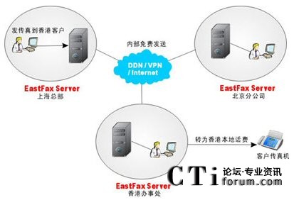在上圖中,某集團(tuán)公司總部位于上海,在北京、香港有分支機(jī)構(gòu),與分支機(jī)構(gòu)及客戶之間經(jīng)常有大量的傳真往來(lái)。目前三個(gè)地方已通過VPN實(shí)現(xiàn)了網(wǎng)絡(luò)互通,且均安裝了EastFax傳真服務(wù)器。