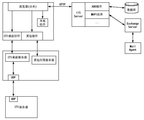 對于所有的電力業(yè)務(wù)模塊都是在IE瀏覽器上實現(xiàn),瀏覽器上的應(yīng)用模塊對WEB Server發(fā)出請求,WEB Server解釋運(yùn)行ASP程序,利用ASP創(chuàng)建數(shù)據(jù)庫組件訪問系統(tǒng)的數(shù)據(jù)庫信息;利用嵌入WEB頁面的CTI桌面控件可以實現(xiàn)CTI集成功能,如:建立呼叫、應(yīng)答呼叫、席間轉(zhuǎn)移、人工自動切換等等;利用其他嵌入WEB網(wǎng)頁的組件實現(xiàn)其他擴(kuò)展功能,如:Exchange