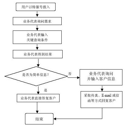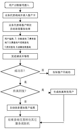 系統(tǒng)自動報受理人員工號,人工交互式受理方式。受理人員根據(jù)用戶要求從服務(wù)質(zhì)量標(biāo)準(zhǔn)數(shù)據(jù)庫、電費(fèi)數(shù)據(jù)庫和其他相連的數(shù)據(jù)庫查詢資料,然后通過語音方式播報資料或送到用戶指定的傳真機(jī)或其他終端設(shè)備上。主要內(nèi)容如下: