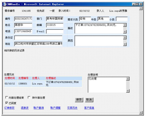 客戶向麥考林定購商品的最常用途徑就是電話訂貨,客戶撥打麥考林服務(wù)熱線進(jìn)入客服系統(tǒng)。系統(tǒng)會(huì)根據(jù)客戶的主叫號碼對客戶進(jìn)行識別,如果識別成功,座席代表屏幕上會(huì)自動(dòng)彈出客戶資料和以往訂貨記錄;如果識別失敗,座席代表可以根據(jù)客戶通報(bào)的客戶代碼或姓名等信息查詢客戶資料。如果是新客戶,座席代表可以立即為他創(chuàng)建客戶檔案。
