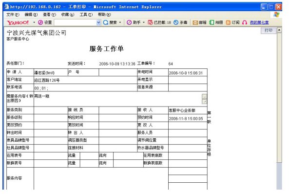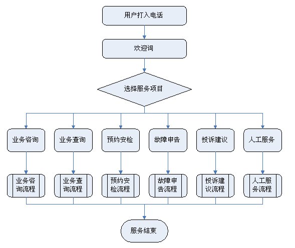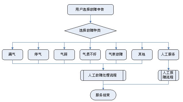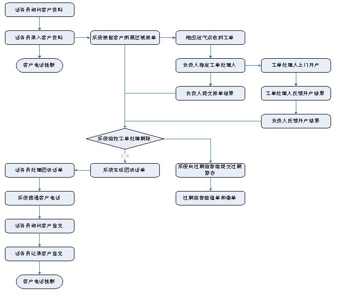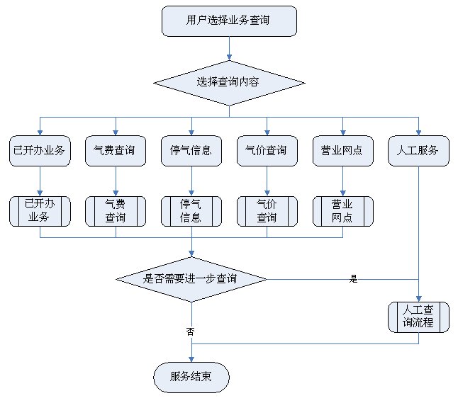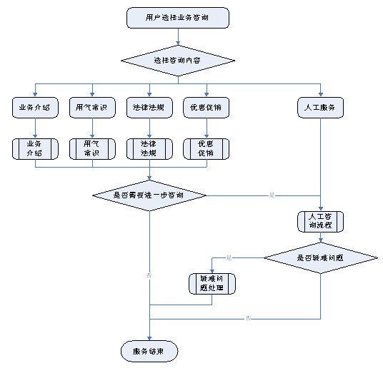 1)業(yè)務(wù)咨詢:用戶通過人工、自動(dòng)語音等方式咨詢有關(guān)政策法規(guī)、資費(fèi)標(biāo)準(zhǔn)、用氣常識、報(bào)裝方法等,系統(tǒng)以語音、傳真、Email、短消息等方式回復(fù)客戶。