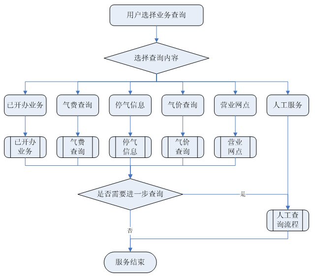 業(yè)務(wù)查詢:用戶可通過(guò)受理人員或自動(dòng)語(yǔ)音應(yīng)答系統(tǒng)根據(jù)用戶要求從數(shù)據(jù)庫(kù)查詢資料,然后通過(guò)語(yǔ)音方式播報(bào)或送到用戶指定傳真機(jī)或其他終端設(shè)備上。應(yīng)考慮以后用web方式查詢氣費(fèi)等數(shù)據(jù),以不動(dòng)及主體設(shè)備方式平滑升級(jí)。