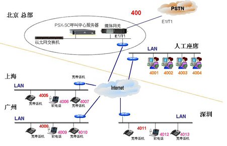 PSX-CC呼叫中心系統(tǒng)服務(wù)器放在北京總部機(jī)房,上海,深圳,廣州三地均通過(guò)互聯(lián)網(wǎng)將遠(yuǎn)端座席注冊(cè)到總部系統(tǒng),為了節(jié)省硬件投資,所有座席采用軟件電話。座席電話有錄音功能,并且可隨時(shí)查看通話清單。系統(tǒng)可配合目前的400,800電話,將所有呼入電話轉(zhuǎn)入遠(yuǎn)端坐席,讓呼叫中心沒有地域的限制。