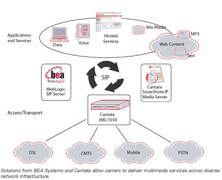 BEA提供領(lǐng)先的SOA基礎(chǔ)架構(gòu),同時它還提供可以在即使是完全不同的IT環(huán)境中建立應(yīng)用和管理SOA的強(qiáng)大的、 基于標(biāo)準(zhǔn)的平臺。BEA WebLogic Communications Platform (WebLogic 通信平臺)是第一個提供在運(yùn)營商級環(huán)境中、全業(yè)務(wù)功能的融合IT和電信的平臺。它使得運(yùn)營商可以通過加強(qiáng)利用固網(wǎng)和無線網(wǎng)開展多樣的數(shù)字內(nèi)容和視頻服務(wù)的能力,從而增加收入。其WebLogic SIP 服務(wù)器提供了必需的呼叫建立和會話管理,但是,運(yùn)營商仍然需要高級的媒體處理能力,以及能夠與BEA 解決方案進(jìn)行互操作的標(biāo)準(zhǔn)接口,從而使得運(yùn)營商可以提供可擴(kuò)展的語音、視頻和多媒體服務(wù)。他們同時需要有媒體網(wǎng)關(guān)以實現(xiàn)跨網(wǎng)絡(luò)的連接。Cantata與BEA Systems 合作,提供與BEA的WebLogic SIP服務(wù)器可靠的交互操作性,同時,運(yùn)營商可以利用Cantata的SnowShore IP媒體服務(wù)器以及集成媒體網(wǎng)關(guān)1010實現(xiàn)跨固網(wǎng)和無線網(wǎng)語音和多媒體服務(wù)。