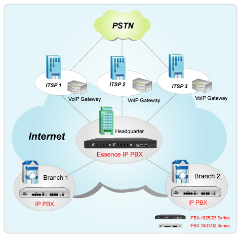 Essence IPBX系列可以注冊(cè)者之形式注冊(cè)于其他SIP協(xié)定伺服器上,如ITSP運(yùn)營(yíng)平臺(tái),或是分公司之小型IP PBX注冊(cè)至總公司之大型IP PBX ,均可透過Internet 將話務(wù)無限延伸。