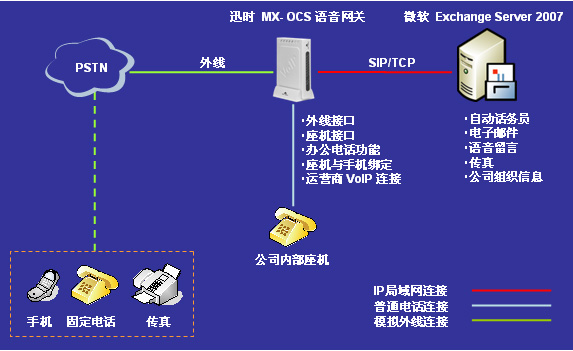 迅時(shí)通信針對微軟統(tǒng)一溝通解決方案,在2008年推出了MX-OCS系列辦公型VoIP語音網(wǎng)關(guān)。將微軟Exchange Server 2007 統(tǒng)一消息服務(wù)器與迅時(shí)通信MX-OCS網(wǎng)關(guān)集成而構(gòu)成的解決方案(簡稱“1+1”方案),能大幅降低中小企業(yè)擁有統(tǒng)一溝通平臺的成本。