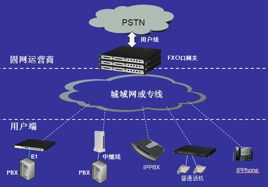 “固網(wǎng)IP化”方案無(wú)需軟交換,延用現(xiàn)有的數(shù)字程控交換機(jī)與業(yè)務(wù)支持系統(tǒng)作為核心網(wǎng)業(yè)務(wù)平臺(tái),只是在交換機(jī)外圍增加實(shí)現(xiàn)模擬/數(shù)字語(yǔ)音信號(hào)轉(zhuǎn)換成IP的VoIP網(wǎng)關(guān),并通過(guò)IP網(wǎng)絡(luò)實(shí)現(xiàn)與遠(yuǎn)程客戶(hù)終端設(shè)備的連接。遠(yuǎn)程的用戶(hù)端設(shè)備可以是傳統(tǒng)設(shè)備,如普通電話(huà)、傳真機(jī)或小型交換機(jī),也可以是基于IP的語(yǔ)音設(shè)備,如SIP電話(huà)、IPPBX等(如下圖所示)?梢詫(shí)現(xiàn)小區(qū)放號(hào)、企業(yè)直線(xiàn)電話(huà)、企業(yè)語(yǔ)音交換機(jī)接入等業(yè)務(wù)。