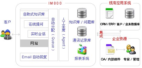 IM800是首家提出并實(shí)現(xiàn) “ 網(wǎng)上服務(wù)3.0 ” 思想的新一代綜合網(wǎng)上客戶服務(wù)和支持系統(tǒng),包括各種豐富的“自助服務(wù)” 和 “人工服務(wù)” 產(chǎn)品模塊:
