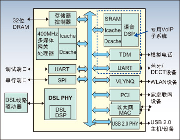 圖2演示了這種架構(gòu)的一個(gè)例子,即一款帶集成ADSL和VDSL2寬帶連接功能的SoC。該SoC具有一個(gè)工作在400MHz頻率的多媒體網(wǎng)關(guān)處理器,性能比以前產(chǎn)品提升了一倍。附加的硬件加速器和32位寬的存儲器接口進(jìn)一步提升了該網(wǎng)關(guān)的聯(lián)網(wǎng)能力。