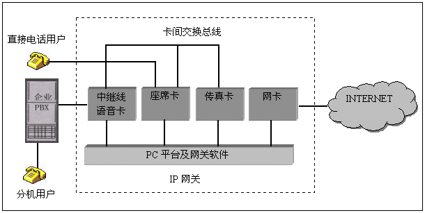 在PC機(jī)平臺內(nèi),可插入三種不同類型的語音卡,中繼卡用于連接企業(yè)原有的用戶交換機(jī),使得分機(jī)用戶可以通過IP網(wǎng)絡(luò)接打電話,中繼線可采用模擬線或數(shù)字中繼線、座席卡用于直接連接電話用戶,常用于沒有用戶交換機(jī)的場合;傳真卡用于完成IP網(wǎng)絡(luò)上的傳真中繼功能。所有的語音卡之間采用卡間交換總線相連,以便實現(xiàn)互相通話和傳真資源共享。PC平臺內(nèi)一般還需要網(wǎng)卡實現(xiàn)與INTERNET的連接。網(wǎng)關(guān)軟件是該IP網(wǎng)關(guān)的關(guān)鍵部分,完成對語音卡的控制和IP協(xié)議處理。