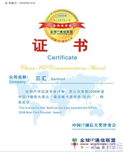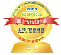 9月19日,在上海盛大舉行的CIPCC中國IP通信大會上,杭州三匯摘取了CIPCA 2008年國內(nèi)最佳語音板卡提供商大獎,體現(xiàn)了杭州三匯在國內(nèi)語音卡領(lǐng)域的絕對領(lǐng)導(dǎo)和優(yōu)勢地位。