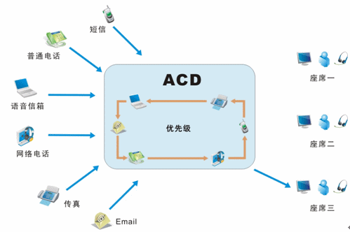 我們目前接入的媒體有很多,不再是傳統(tǒng)的單一電話接入方式,還包括網(wǎng)絡(luò)呼入、E-mail呼入,短信、留言等,所有的媒體接入都通過(guò)統(tǒng)一的排隊(duì)路由,以最優(yōu)化的策略分配給最適合的座席人員;并且,不同的媒體類型具有不同的優(yōu)先級(jí),ACD(自動(dòng)話務(wù)分配)根據(jù)優(yōu)先級(jí)和設(shè)定的排隊(duì)算法,自動(dòng)實(shí)現(xiàn)媒體的統(tǒng)一智能路由。