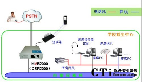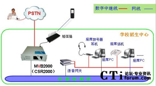 暢信達(dá)電話招生呼叫中心是采用數(shù)字中繼線(或者模擬電話線)接入,人工座席受理,采用MVB2000作為呼叫中心交換系統(tǒng),CSR2000作為呼叫中心業(yè)務(wù)系統(tǒng)的系統(tǒng)架構(gòu)形式,系統(tǒng)架構(gòu)圖如下: