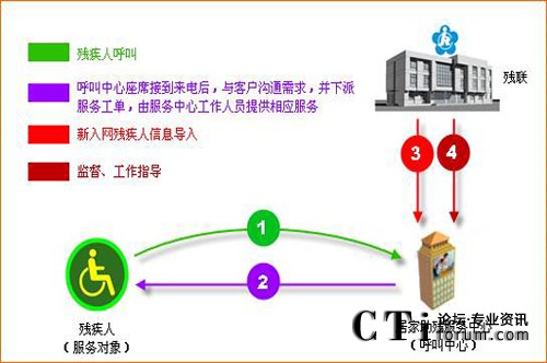 根據(jù)服務(wù)轄區(qū)內(nèi)殘疾人的情況,殘聯(lián)將需要提供居家服務(wù)的對(duì)象提供給服務(wù)中心,服務(wù)中心將殘疾人檔案信息上傳于系統(tǒng)內(nèi)。當(dāng)殘疾人通過手機(jī)或固定電話撥打“服務(wù)中心服務(wù)統(tǒng)一電話號(hào)碼”(或采用一鍵呼叫的話機(jī)呼叫“服務(wù)中心服務(wù)統(tǒng)一電話號(hào)碼”)時(shí),服務(wù)中心的座席電腦上就會(huì)彈出殘疾人信息(包括:名字、地址、聯(lián)系電話、殘疾類別與等級(jí)、身份證號(hào)碼、殘疾證號(hào)、監(jiān)護(hù)人性姓名、監(jiān)護(hù)人電話等等)。具體流程如下: