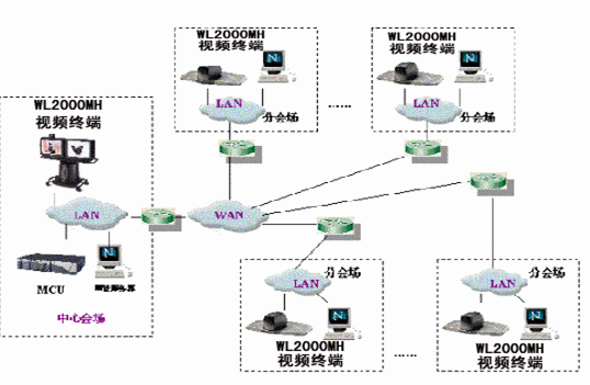 分會(huì)場(chǎng)配置WL-2000MH會(huì)議終端,具有快速以太網(wǎng)LAN接口,在H.323上可達(dá)到4M。實(shí)際應(yīng)用中,分會(huì)場(chǎng)工作速率在512K-2M自適應(yīng)可調(diào)。中心會(huì)場(chǎng)可通過局域網(wǎng)對(duì)分會(huì)場(chǎng)設(shè)備遠(yuǎn)程管理。終端通過RS232口連接攝像機(jī),中心會(huì)場(chǎng)可進(jìn)行遙控分會(huì)場(chǎng)的攝像機(jī),注本地也可以進(jìn)行攝像機(jī)控制。WL-2000MH會(huì)議終端有兩路視頻輸出,一路為遠(yuǎn)端視頻,一路為本地視頻,分會(huì)場(chǎng)可選擇兩個(gè)顯示設(shè)備如大屏幕彩電或背投電視。
