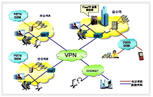 FreePP獨有的群組功能可以幫助企業(yè)將其總部與分支機構(gòu)原本各自獨立的若干個PBX整合成為一個PBX,實現(xiàn)Internet、PSTN網(wǎng)絡(luò)上通信應(yīng)用的融合,幫忙企業(yè)擺脫對傳統(tǒng)通信運營商的依賴,完全掌握自己的通信網(wǎng)絡(luò)。通過為PBX外線上的若干個FreePP Box (或MPES)分配一個Group Number,PBX內(nèi)線上的分機按照PBX上的設(shè)定來獲取Group Number中的一個FreePP Box,進而通過這個FreePP Box來呼叫另外一組Group Number 連接的PBX分機號碼。他們相互間的通信完全基于Internet實現(xiàn),無需象傳統(tǒng)方式那樣交納通信費用。