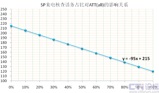 我們把話務(wù)構(gòu)成簡單化,假設(shè)只有“來電核查”和“Inbound”兩大隊列,在上下6%的波動范圍內(nèi),取ATT(sp)=120秒,ATT(in)=215秒,“SP來電核查”話務(wù)占比=x,則“Inbound”話務(wù)占比=1-x,ATT(all)=y(tǒng),整體通話均長y與“SP來電核查”話務(wù)占比x存在如下線性關(guān)系:(下圖13)