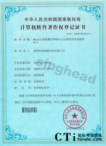 CTI論壇(ctiforum)5月19日消息(記者 楊佳林):2010年4月27日,深圳市深海捷科技有限公司申請(qǐng)的《Mixcall家政服務(wù)網(wǎng)絡(luò)中心運(yùn)營(yíng)管理系統(tǒng)軟件V1.0》著作登記獲得國(guó)家版權(quán)局審核并通過(guò)。