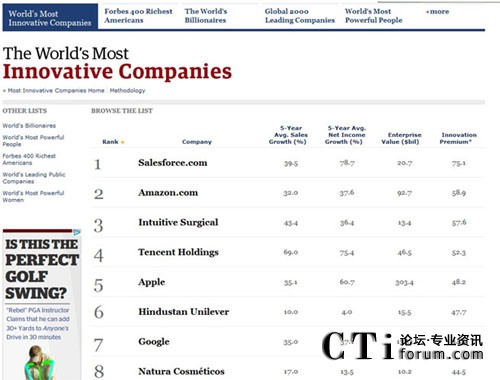 CTI論壇(ctiforum)8月15日消息(記者 張潔):2011年7月,由美國知名財(cái)經(jīng)雜志《福布斯》評(píng)選出的全球百大最具創(chuàng)新能力企業(yè)排行榜上,salesforce.com超越Facebook、蘋果、亞馬遜等知名企業(yè)位列第一。