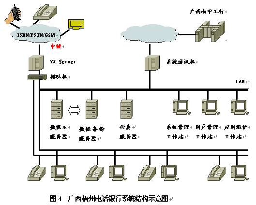 廣西工行推出的第一套銀行呼叫中心系統(tǒng)是在潤聲VX綜合信息系統(tǒng)開發(fā)平臺(UNIX版)上,在較短時間內(nèi)開發(fā)成功,首先在梧州分行開通運行,獲得用戶的一致好評,并希望與潤聲公司進(jìn)一步合作。該系統(tǒng)的結(jié)構(gòu)如圖4所示。