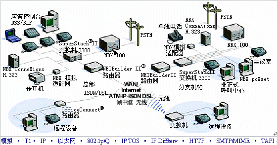 使用標準多協(xié)議路由器,諸如3Com PathBuilder或NET Builder II路由器,您能夠通過廣域網(wǎng)或Internet將多個分支機構與您的總部系統(tǒng)相連接。您可以隨意選擇網(wǎng)絡: 支持工業(yè)標準Internet協(xié)議(IP)聯(lián)網(wǎng)的DSL、電纜、幀中繼或ISDN。您甚至能夠通過使用3Com NBX ConneXtions H.323網(wǎng)關應用,來充分利用低成本、高質量的IP語音 (VoIP) H.323服務。因為NBX ConneXtion使用Internet作為長途線路上本地到本地的撥號路徑,因此它能夠以極低的成本提供傳統(tǒng)電話專用線路和后端分機(OPX)線路的優(yōu)勢。