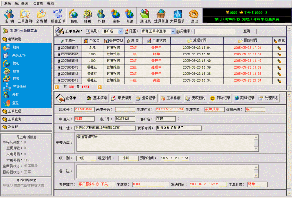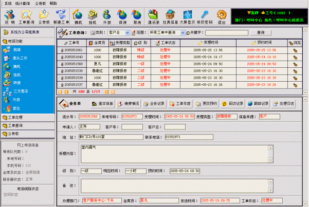 系統(tǒng)聯(lián)通了座席員、營業(yè)廳業(yè)務(wù)員、工程管理人員、維修網(wǎng)點(diǎn)派工人員、外勤維修人員、公司管理人員等各種角色使用系統(tǒng)的界面。