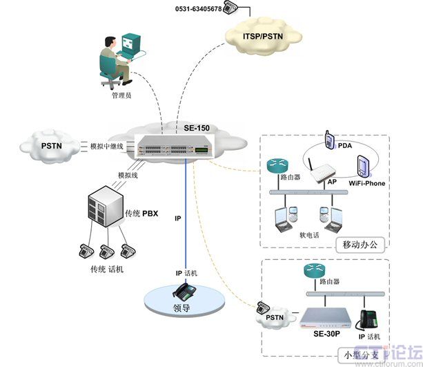 在企業(yè)總部可以部署一臺(tái)IP-PBX(如SE150)作為核心設(shè)備,通過模擬中繼接口連接PSTN電話網(wǎng),通過模擬分機(jī)接口連接企業(yè)原有的PBX交換機(jī),再通過IP話機(jī)或網(wǎng)關(guān)來擴(kuò)展新增用戶。IP-PBX下的分機(jī)用戶可以通過模擬中繼連接外線電話,也可以通過IP中繼連接到ITSP的NGN平臺(tái)實(shí)現(xiàn)外線呼叫,系統(tǒng)通過路由設(shè)定來自動(dòng)判斷分機(jī)的對(duì)外呼叫應(yīng)該由哪條中繼處理,實(shí)現(xiàn)最優(yōu)路由和話費(fèi)的最大節(jié)省。