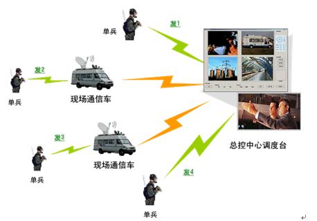 在具體應(yīng)用中,工作人員(士兵)攜帶單兵背負(fù)終端深入現(xiàn)場(chǎng)(災(zāi)區(qū)、廣場(chǎng)、戰(zhàn)場(chǎng)等),將現(xiàn)場(chǎng)視頻實(shí)時(shí)回傳到后方的應(yīng)急通信車或指揮中心,同時(shí)現(xiàn)場(chǎng)人員可以和指揮中心建立雙向語(yǔ)音通信,指揮中心根據(jù)現(xiàn)場(chǎng)真實(shí)的視頻信息并結(jié)合現(xiàn)場(chǎng)人員語(yǔ)音匯報(bào),可以做出更有針對(duì)性、更具準(zhǔn)確性的指揮決策。