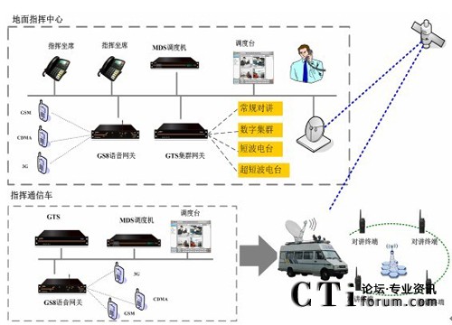 整體系統(tǒng)由地面指揮中心和指揮通信車組成,指揮中心和通信車分別部署調(diào)度臺(tái),均可指揮現(xiàn)場。地面指揮中心和指揮通信車通過部署衛(wèi)星設(shè)備,通過衛(wèi)星鏈路進(jìn)行通信,當(dāng)衛(wèi)星鏈路出現(xiàn)故障時(shí),指揮車也可通過移動(dòng)網(wǎng)絡(luò)(GSM/CDMA/3G)與地面指揮中心互聯(lián)互通。
