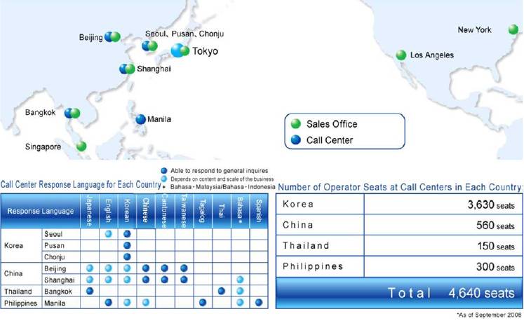 transcosmos運用亞洲各呼叫中心營運點提供客戶所需的業(yè)務種類和語言服務。每個運營分部支持包括本地語言的多語種, 較少的運營點覆蓋低業(yè)務量地區(qū)從而實現(xiàn)客戶要求的較低的運營成本。這對滿足那些多語種要求的客戶來說尤其重要。