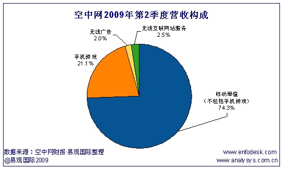 空中網(wǎng)2009年第2季度總營(yíng)收為3230萬(wàn)美元,其中總無(wú)線增值服務(wù)(不包括手機(jī)游戲)營(yíng)收為2393萬(wàn)美元,同比增長(zhǎng)10%,比上一季度增長(zhǎng)1%,占總營(yíng)收的74.09%;手機(jī)游戲占總營(yíng)收的21.05%,比上一季度增長(zhǎng)38%;這一季度,空中網(wǎng)將無(wú)線廣告和無(wú)線互聯(lián)網(wǎng)站服務(wù)的收入共同歸為無(wú)線互聯(lián)網(wǎng)服務(wù)營(yíng)收,總值為156萬(wàn)美元,其中41%來(lái)自于無(wú)線廣告,59%來(lái)自于空中網(wǎng)無(wú)線互聯(lián)網(wǎng)站服務(wù)(包括虛擬物品銷售以及手機(jī)游戲和無(wú)線增值服務(wù)的交叉銷售)。易觀國(guó)際(Analysys