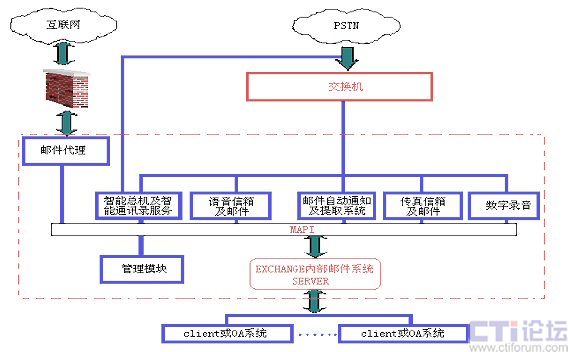 本系統(tǒng)中采用Exchange Sever構(gòu)成內(nèi)部郵件系統(tǒng),用于單位內(nèi)部郵件交流或存放收到的語音、傳真、電子郵件等。