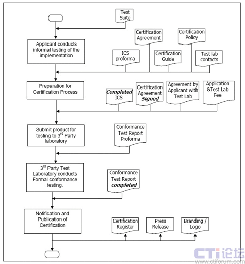 測試項目的主要目的是通過提供一種測試一致性和互操作性的程序,來促使并認可廠商和用戶充分利用VoiceXML論壇所創(chuàng)建的有價值的標準。帶有“通過VoiceXML認證”(VoiceXML Certified)字樣的應(yīng)用是指的滿足一致性需求,并且通過VoiceXML認證計劃對其兼容性進行了認證的應(yīng)用。整個認證計劃擁有一套嚴格而細致的流程,如圖2所示。