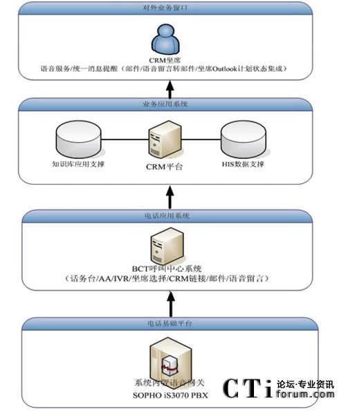 原先電話系統(tǒng)與CRM系統(tǒng)是獨(dú)立的兩個(gè)系統(tǒng),客服人員面對(duì)大量的客戶,迅速的獲悉來(lái)電客戶的身份、背景資料以及歷史資料在很大程度上決定了其服務(wù)質(zhì)量。BCT呼叫中心系統(tǒng)位于PBX與CRM之間,作為一個(gè)中間的橋梁,對(duì)PBX送來(lái)的電話信息或者用戶輸入的卡號(hào)等數(shù)據(jù)進(jìn)行處理分析,對(duì)主叫號(hào)碼或用戶輸入卡號(hào)進(jìn)行識(shí)別后,傳遞給CRM;CRM檢索與其相連的HIS(醫(yī)院信息系統(tǒng))的數(shù)據(jù)庫(kù),將客戶資料以及相關(guān)的歷史記錄通過(guò)彈出網(wǎng)頁(yè)的模式,同步的顯示在坐席的計(jì)算機(jī)上,方便客服代表的輸入和后續(xù)操作,提高了效率與正確率。同時(shí),客戶代表還可以在CRM頁(yè)面中點(diǎn)擊電話號(hào)碼,通過(guò)BCT發(fā)起電話呼叫來(lái)聯(lián)系客戶,來(lái)處理用戶回訪等工作。