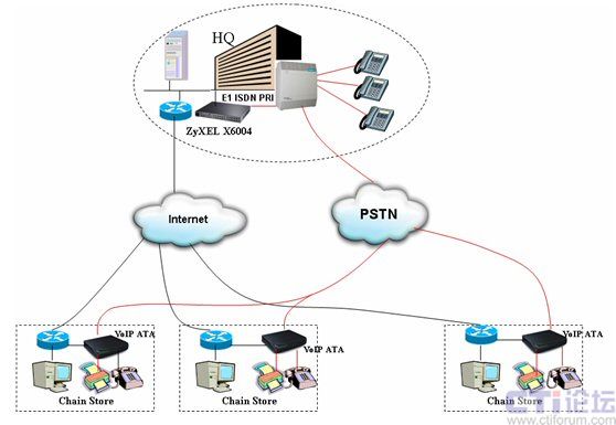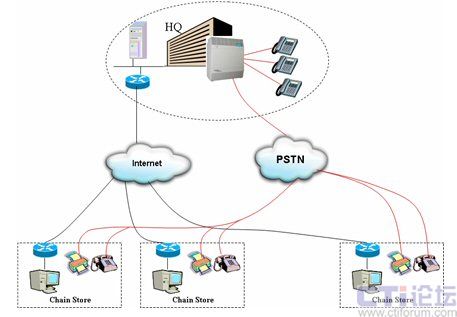通過這種架構(gòu),各連鎖分店的話機(jī)與總部內(nèi)部話機(jī)之間的聯(lián)系便可以透過IP網(wǎng)絡(luò)進(jìn)行,無須再支付任何長途通話費用。